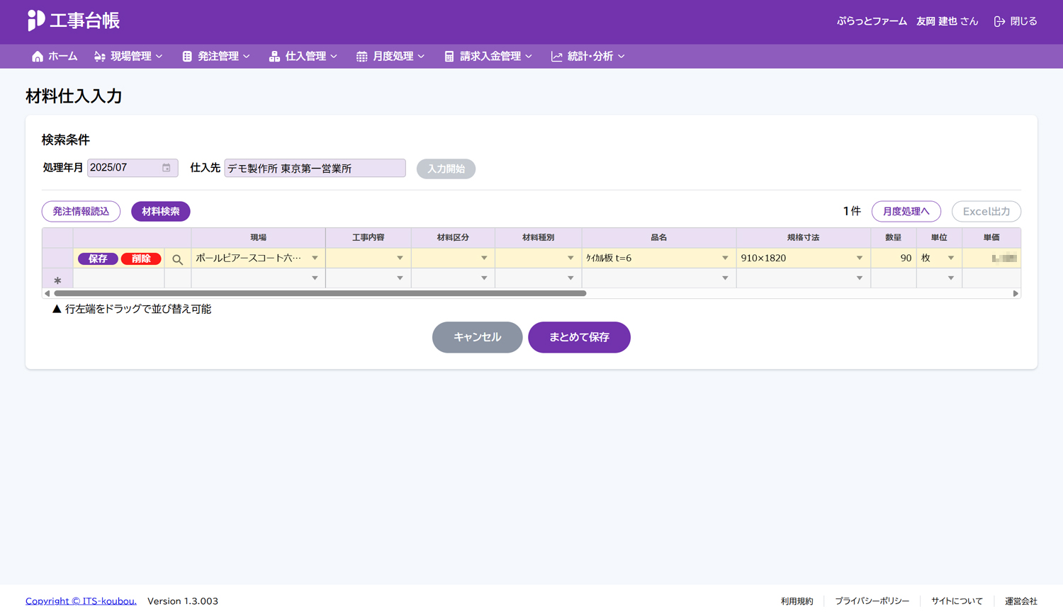 材料仕入入力画面が表示されます。処理年月には当月が自動入力(変更可能)
