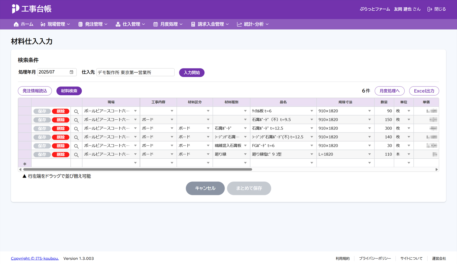 工事台帳では、材料発注情報の読込・直接入力・検索から一括登録の3種類の方法で材料仕入が登録できます。