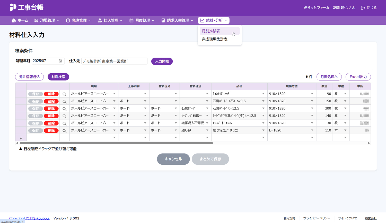 作成した材料仕入情報はエクセル出力が可能です。また、月別推移表で仕入情報の統計が確認できます。