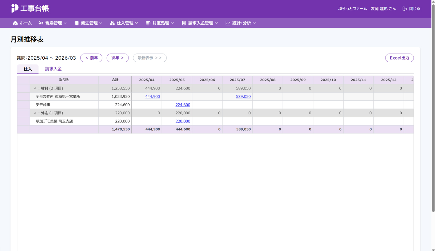 月別推移表が表示されます。先程登録した[2025/07][デモ製作所 東京第一営業所]に表示されている仕入金額をクリックします。※自社の決算月によって表示される期間が変更