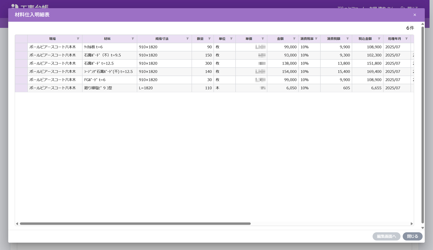 材料仕入の明細表が表示されます。直接入力・発注情報読込・材料検索・リスト選択、4つの方法で仕入明細の作成が可能です。