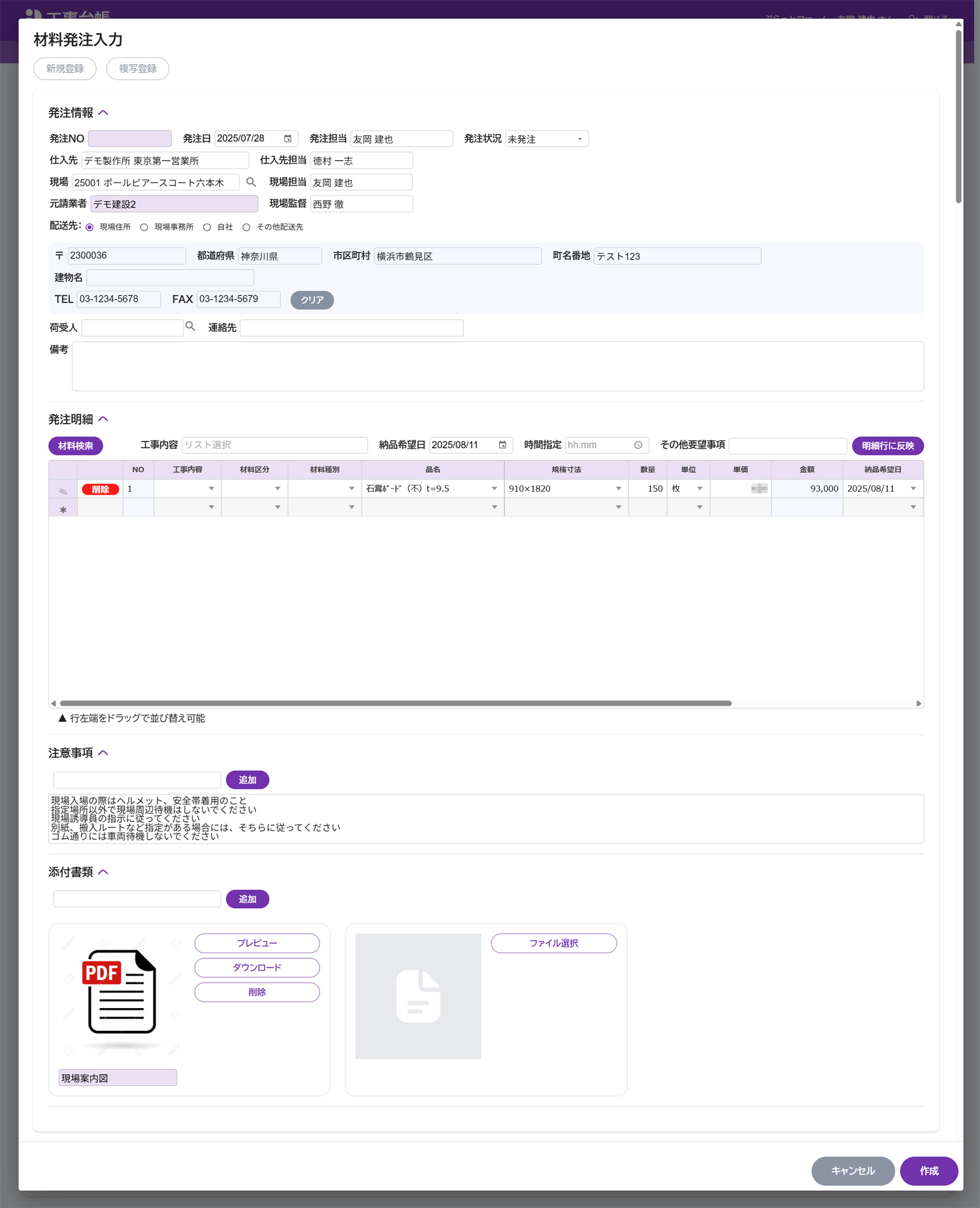 現場作成で登録した添付書類が自動で読み込まれます。※PDF・各種画像データが添付可能