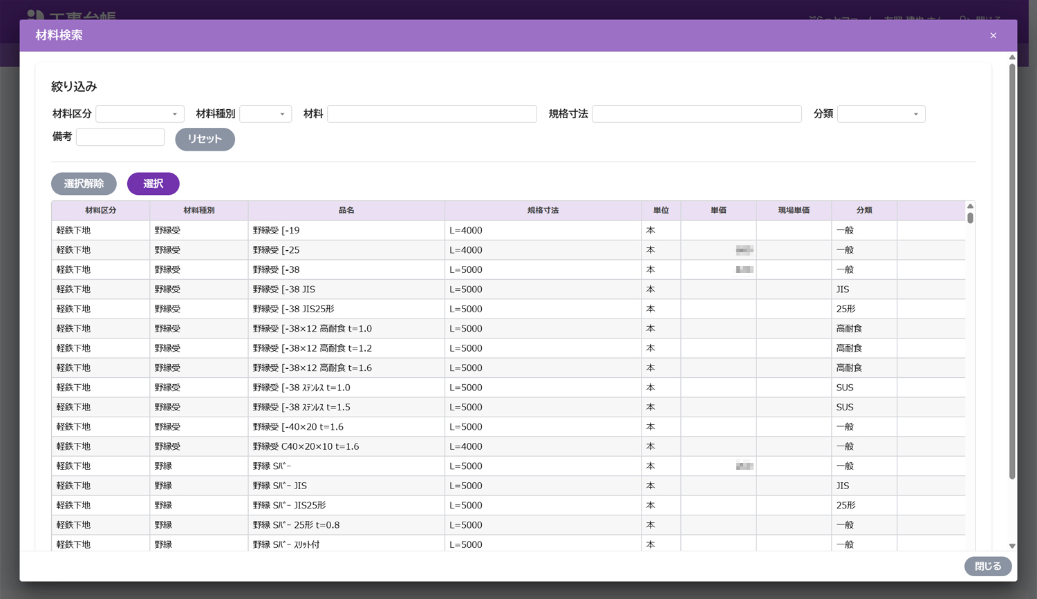 【材料検索】材料検索画面には、マスタ管理に登録されている材料が表示されます。
