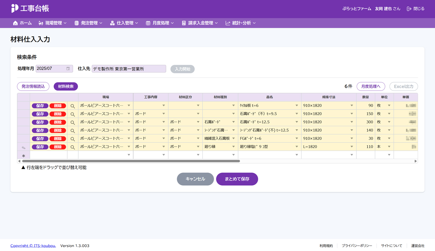 工事台帳では、材料発注情報の読込・直接入力・検索から一括登録の3種類の方法で材料仕入が登録できます。